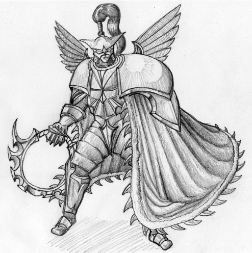 While repeating this for every other part of the Warden, keep in mind, not to be afraid of very dark and very bright parts, if the surrounding makes it neccessary. So the inner part of the coat will be nearly black, because it's not hit by any light, while the right metalwing is kinda close to the lightsource and may be close to white. Remember: The harder and reflectiv the material is, the harder may the contrasts be.