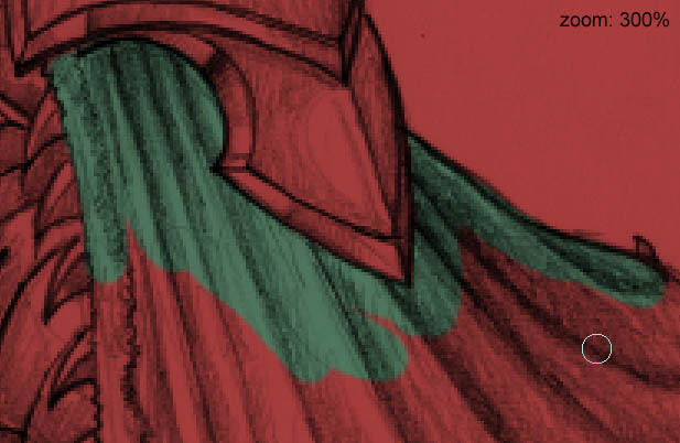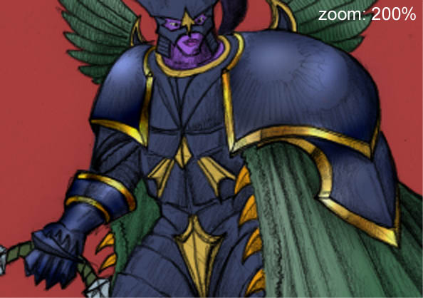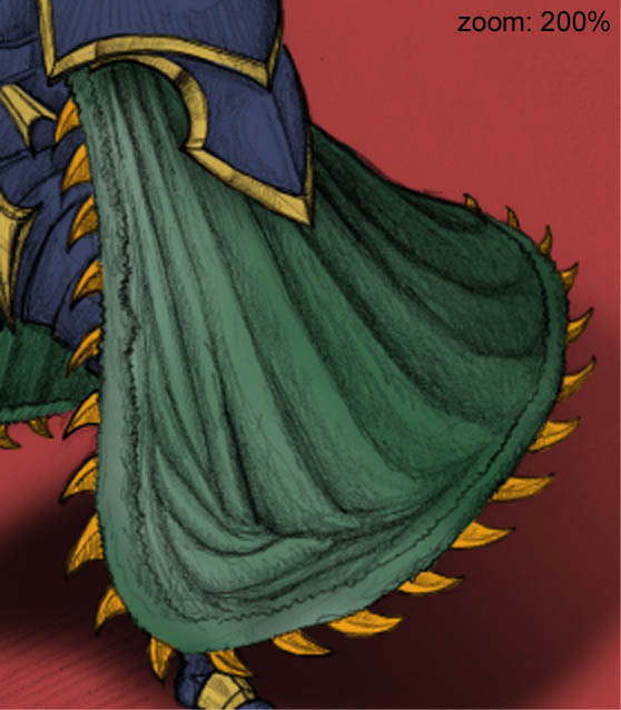 First make sure you know from what angle the light is coming from. A preshaded sketch offers lots of hints for this. The Warden, for example, has it's lightsource above and a little in front, righthand (roughly estimated). Lightspots on the armor and shadows in the coat are already set, too.