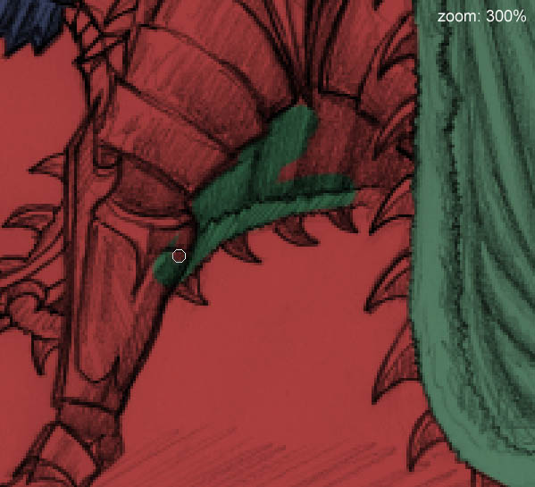 So after we created the background and watched speechless how the sketch isn't black on white anymore but black on red, we may start with the actual coloring. I often work zoomed in to 200%-300% (Ctrl++ and -) using all kind of hardedged brushes (