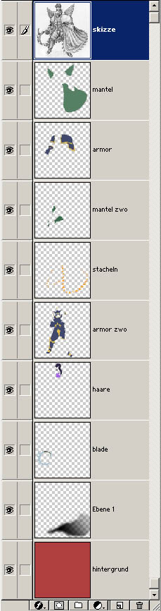 This picture is an animation of different layers. Pay attention on how hasty the lower ones are painted and realize, that i already thought about shading afterwards, so i used two layers for the armor with two colors each.