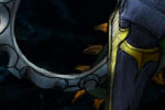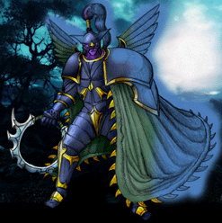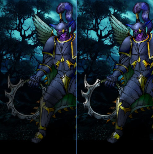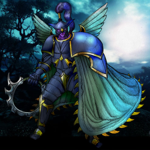 But light needs shadow, so we create a new layer right below the lightgiving one and repeat what just done. Pick a dark blue this time and paint bottom and left of the Warden. The lower you get, the darker should your blue be so you create a nice flowing ... ehm.. flow. After done, don't set the layers blendmode to Color Dodge but choose Darken instead. If this keeps you unsatisfied, try Multiply instead. But now, all our nifty highlights on the blade and other metallic material is gone. So you want to grab a small softedged eraser and remove the shadow everywhere you want it to sparkle.